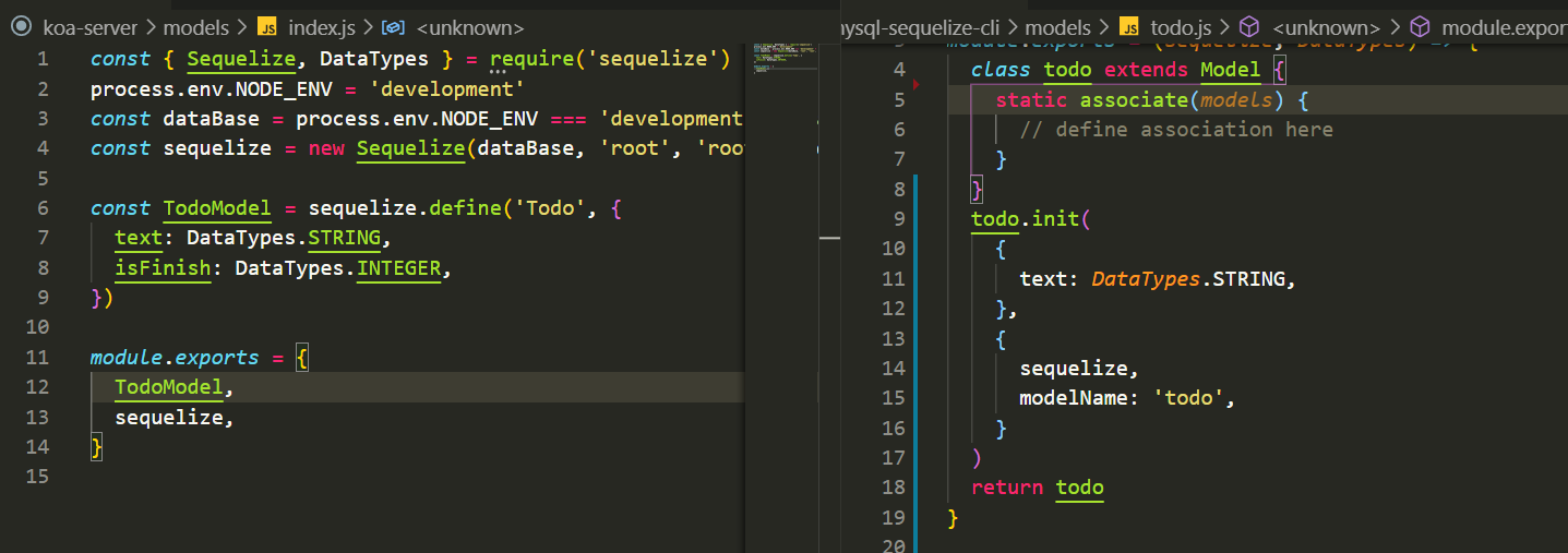 b. 创建 model,model 与数据库中的表对应,截图中左边为在服务端代码中定义 model,右边为通过sequelize-cli自动创建 model 代码。define在内部调用的是init方法。