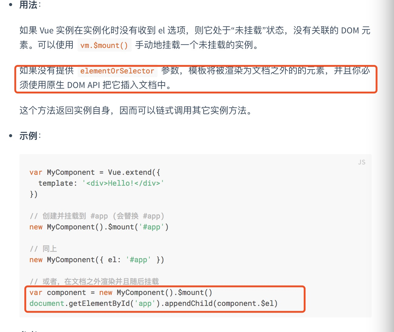 以下 3 种写法实现的功能一样,当新建一个 vue 实例没有提供 el 选项时,通过$mount 方法来手动把元素挂在到#app 上,其中 render 函数中的 App 参数为引入的.vue 文件。